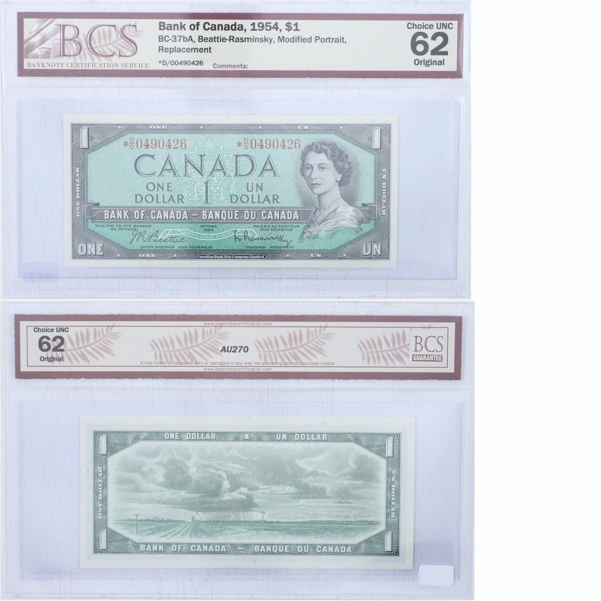 1954 Replacement $1.00 note from the Bank of Canada; cat code BC-37bA, Beattie-Rasminsky signatures, Prefix *D/O, BCS Certified CUNC-62, Original