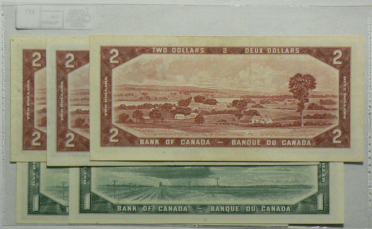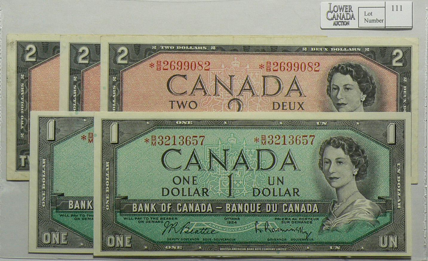 1954 One Dollar Replacement modified, BC-37bA-i, Circulated, Beattie Rasminsky, serial *B/M2680945 & *B/M3213657. 1954 Two Dollars Replacement Modified, BC-38bA, Circulated, Beattie Rasminsky, serial *B/B0256243, *B/B1841502 & *B/B2699082. Lot of 5 notes.