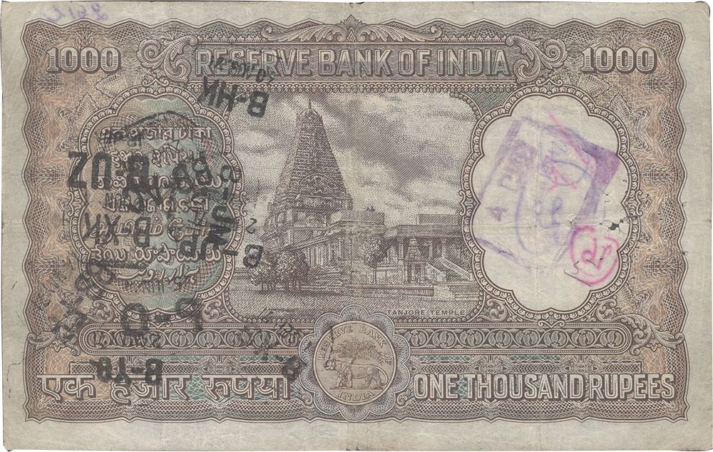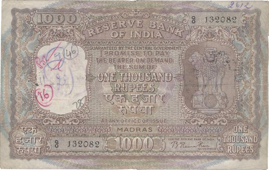 1954 Reserve Bank of India One Thousand Rupees Note Signed by B Rama Rau of Madras Circle.