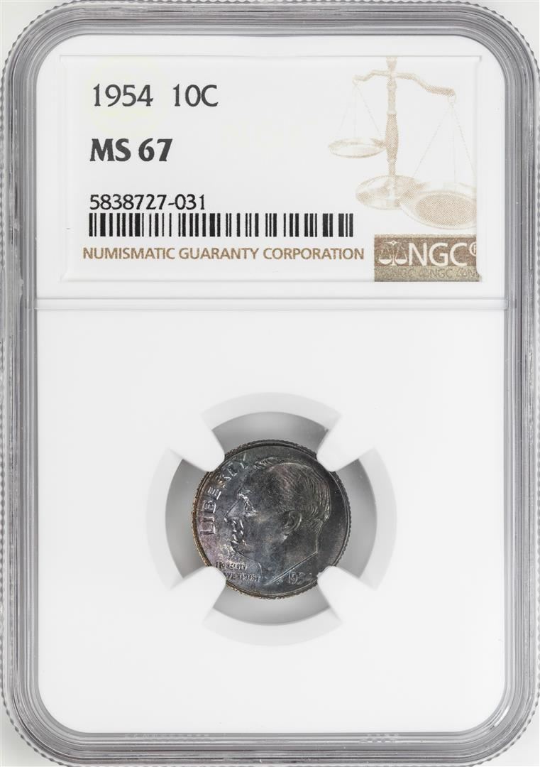 One 1954 Roosevelt Dime Coin NGC MS67 Nice Toning. NGC Certified.