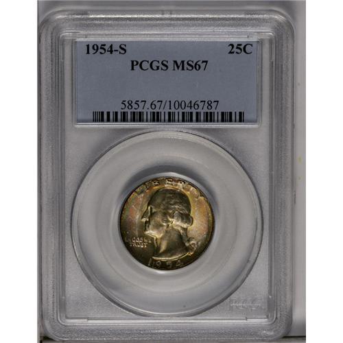 <B>1954-S<25C> MS67 PCGS.</B></I> A deeply toned Superb Gem with intense gold and iridescent toning, slightly lighter on the reverse. Population: 19 in 67, 0 finer (5/06).