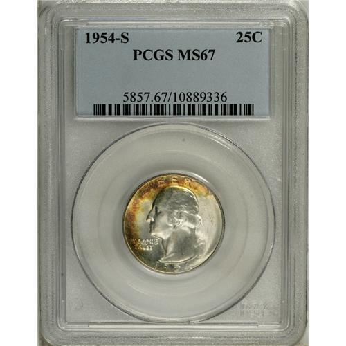 <B>1954-S 25C MS67 PCGS.</B></I> Arcs of gold-orange and peach-rose appear at the left obverse and upper reverse of this otherwise untoned Superb Gem. Solidly struck with attractive luster. Population: 24 in 67, 0 finer (11/06).<BR><BR><b>Shipping:</b> Coin/Currency (<a target="_blank" href="http://www.heritageauctions.com/common/shipping.php">view shipping information</a>)