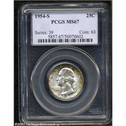 <table><tr><td><TABLE cellSpacing=0 cellPadding=0 width="100%" bgColor=#000000 border=0><TBODY> <TR><TD width="100%"><TABLE cellSpacing=1 cellPadding=3 width="100%" border=0><TBODY><TR><TD width="100%" bgColor=#79735c><FONT face=arial color=#ffffff size=3><B>Description</B> </FONT></TD></TR><TR><TD width="100%" bgColor=#ffffff><FONT face=arial size=2><B>1954-S 25C MS67 PCGS.</B></I> This is another coin that should prove to be of great interest to PCGS Registry Set collectors. Only three other pieces have been so graded by PCGS with none finer (7/03). This is a Superb coin in every way. First, there are no obvious or distracting abrasions on either side. But what is even more important is the thick, frosted mint luster and the rich toning. Much of the obverse remains brilliant with the toning just around the margin. The reverse, however, has deep russet and lime-green accents with an occasional dash of original brilliance. Terrific quality. </FONT></TD></TR></TBODY></TABLE></TD></TR></TBODY></TABLE><BR><A name=PricesRealized></A><TABLE cellSpacing=0 cellPadding=0 width="100%" bgColor=#000000 border=0><TBODY><TR><TD width="100%"><TABLE cellSpacing=1 cellPadding=3 width="100%" border=0><TBODY><TR><TD width="100%" bgColor=#79735c><A name=PR><FONT face=arial color=#ffffff size=3><B>Previous Prices from Heritage Auctions</B> </FONT></A></TD></TR><TR><TD bgColor=#f6f6ed><TABLE cellSpacing=0 cellPadding=0 width="100%" border=1><TBODY><TR><TD align=middle width="33%"><B>Date</B></TD><TD align=middle width="33%"><B>Service</B></TD><TD align=middle width="33%"><B>Price</B></TD></TR><TR bgColor=whitesmoke><TD width="33%"><B>09/23/2003</B></TD><TD width="33%">NGC</TD><TD width="33%">$126.50</TD></TR><TR bgColor=whitesmoke><TD width="33%"><B>01/21/2003</B></TD><TD width="33%">NGC</TD><TD width="33%">$96.60</TD></TR><TR bgColor=whitesmoke><TD width="33%"><B>12/31/2002</B></TD><TD width="33%">NGC</TD><TD width="33%">$138.00</TD></TR><TR bgColor=whitesmoke><TD width="33%"><B>09/17/2002</B></TD><TD width="33%">NGC</TD><TD width="33%">$59.80</TD></TR><TR bgColor=whitesmoke><TD width="33%"><B>12/25/2001</B></TD><TD width="33%">NGC</TD><TD width="33%">$48.00</TD></TR><TR bgColor=whitesmoke><TD width="33%"><B>06/06/2000</B></TD><TD width="33%">NGC</TD><TD width="33%">$30.00</TD></TR><TR bgColor=whitesmoke><TD width="33%"><B>03/24/2003</B></TD><TD width="33%">NGC</TD><TD width="33%">$71.30</TD></TR><TR bgColor=whitesmoke><TD width="33%"><B>03/01/2003</B></TD><TD width="33%">NGC</TD><TD width="33%">$80.50</TD></TR><TR bgColor=whitesmoke><TD width="33%"><B>09/30/2002</B></TD><TD width="33%">NGC</TD><TD width="33%">$77.05</TD></TR><TR bgColor=whitesmoke><TD width="33%"><B>10/07/2001</B></TD><TD width="33%">NGC</TD><TD width="33%">$82.80</TD></TR><TR bgColor=whitesmoke><TD width="33%"><B>10/04/2000</B></TD><TD width="33%">NGC</TD><TD width="33%">$92.00</TD></TR></TBODY></TABLE></TD></TR><TR><TD bgColor=#ffffff><FONT face=arial size=1 ?>PLEASE NOTE: All prices realized reflect the final hammer price PLUS the buyer's premium in auctions that charge a buyer's premium. Each item has a notation at the top of the listing indicating whether that lot included a buyer's premium. Example: A item that sells with a final hammer price of $100 and a 20% buyer's premium will display with a price realized of $120. All information listed is intended to be as accurate as possible, but errors are possible. Please use this guide carefully and inform us of any inaccuracies. </FONT></TD></TR></TBODY></TABLE></TD></TR></TBODY></TABLE><BR><TABLE cellSpacing=0 cellPadding=0 width="100%" bgColor=#000000 border=0><TBODY><TR><TD width="100%"><TABLE cellSpacing=1 cellPadding=3 width="100%" border=0><TBODY><TR><TD width="100%" bgColor=#79735c colSpan=6><FONT face=arial color=#ffffff size=3><B>Price Guide*</B> </FONT></TD></TR><TR bgColor=#f6f6ed><TD align=middle><B>Grade</B> </TD><TD align=middle><B>Coin World<BR>(Trends)</B> </TD><TD align=middle><B>Numismedia<BR>Retail</B> </TD><TD align=middle><B>Numismedia<BR>Wholesale</B> </TD><TD align=middle><B>Coin<BR>Universe</B> </TD><TD align=middle><B>Heritage<BR>Value Index</B> </TD></TR><TR bgColor=#ffffff><TD align=middle>66</TD><TD align=right>---</TD><TD align=right>$55.00</TD><TD align=right>$44.00</TD><TD align=right>$85.00</TD><TD align=right>$44.75</TD></TR><TR style="FONT-WEIGHT: bold" bgColor=#cccfdd><TD align=middle>67</TD><TD align=right>---</TD><TD align=right>$119.00</TD><TD align=right>$95.00</TD><TD align=right>$2,500.00</TD><TD align=right>$927.50</TD></TR><TR bgColor=#ffffff><TD align=middle>68</TD><TD align=right>---</TD><TD align=right>---</TD><TD align=right>---</TD><TD align=right>---</TD><TD align=right>---</TD></TR><TR bgColor=#ffffff><TD colSpan=6><FONT size=1>*All information listed is intended to be as accurate as possible, but errors are possible. No item may be returned or refused based on this information which is provided as a service to our customers. You should contact each pricing source directly to determine the accuracy of this information. </FONT></TD></TR></TBODY></TABLE></TD></TR></TBODY></TABLE><BR><TABLE cellSpacing=0 cellPadding=0 width="100%" bgColor=#000000 border=0><TBODY><TR><TD width="100%"><TABLE cellSpacing=1 cellPadding=3 width="100%" border=0><TBODY><TR><TD width="100%" bgColor=#79735c><FONT face=arial color=#ffffff size=3><B>Population Guide</B> </FONT></TD></TR><TR bgColor=#ffffff><TD align=middle><!-- Begin Output of Population Grid--><TABLE cellSpacing=0 cellPadding=0 width="100%" border=0><TBODY><TR><TD vAlign=center><TABLE cellSpacing=0 width="100%" border=1 cellsadding="3"><TBODY><TR><TD vAlign=center><TABLE cellSpacing=0 cellPadding=3 width="100%" border=1><TBODY><TR><TD vAlign=center align=middle bgColor=#f0f1e8 colSpan=2 <CENTER><FONT face=Arial size=2><B>PCGS Pop </B></FONT><CENTER></CENTER></TD><TD vAlign=center align=middle bgColor=#f0f1e8 colSpan=2><CENTER><FONT face=Arial size=2><B>NGC Pop</B></CENTER></FONT></TD></TR><TR><TD vAlig