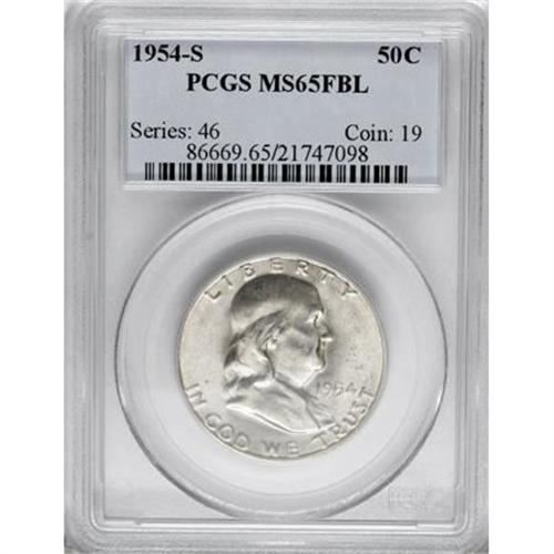 <B>1954-S 50C MS65 Full Bell Lines PCGS.</B></I> PCGS Population (557/63). NGC Census: (35/6). Numismedia Wsl. Price for NGC/PCGS coin in MS65: $276. (#86669)<BR><BR><b>Shipping:</b> Coins & Currency (<a target="_blank" href="http://www.heritageauctions.com/common/shipping.php">view shipping information</a>)