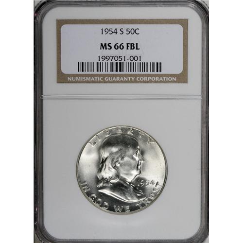 <B>1954-S 50C MS66 Full Bell Lines NGC.</B></I> Satiny and virtually untoned with a crisp strike and a well preserved obverse. A portion of the bell shows minor marks. NGC has certified only six coins in this condition and none finer (10/06).<BR><BR><b>Shipping:</b> Coin/Currency (<a target="_blank" href="http://www.heritageauctions.com/common/shipping.php">view shipping information</a>)