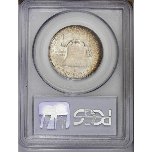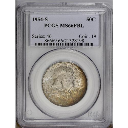 <B>1954-S<50C> MS66 Full Bell Lines PCGS.</B></I> Speckles of russet-brown and apple-green patina endow this lustrous and exquisitely preserved Premium Gem. While the 1954-S is readily available in abraded Mint State grades, it becomes decidedly rare in such near-pristine state. Crisply struck and original. PCGS has graded only one coin finer (3/06). <BR><BR><B>Important notice:</B> Heritage usually auctions material at the rate of 200-250 lots per hour. On some occasions eBay Live bid software or the Internet may not be able to keep up with the pace of the auction. We recommend placing a realistic absentee bid now as insurance to avoid disappointment. Occasionally the auctioneer may eliminate or reject an eBay Live bid, and the auctioneer may also reopen a lot after the close of the eBay live bidding (usually because we missed an audience bid), and may reject your bid even if it shows you as the winning bidder. By bidding via eBay Live, you agree that Heritage may award the lot to another bidder at its sole discretion under the circumstances described above or any other reasonable circumstances. Since eBay bids are not shown to us until we open the lot on the floor, we treat those bids just like floor bids. In most cases the floor responds before the eBay bid is presented to us, due to Internet lag time, so for consistency we have made it a policy that floor bids are always considered first over tie eBay live bids. Also please note that all Heritage lots purchased through eBay Live carry a 20% Buyer's Premium. Please make sure you read the Terms and Conditions before you bid. This lot is being auctioned in conjunction with a live floor auction by Heritage Galleries & Auctioneers. All final auction and invoice information will be supplied by Heritage Galleries & Auctioneers, and all other information should be considered preliminary. Lot:3111 <BR><BR><B>Winning Notification and Billing:</B> After the FINAL session in this auction is complete, Heritage will send e-mail and snail mail invoices. This process normally takes several days. All final auction and invoice information will be supplied by Heritage Galleries & Auctioneers, and all other information should be considered preliminary. <BR><BR>This auction will be conducted on a live auction floor and over the Internet through eBay Live. If you choose to place an absentee bid, please take a moment to <font color='#0000ff'><u><a href='http://pages.ebay.com/liveauctions/help/before/laabsentee.html'>learn how eBay Live absentee bidding works</a></u></font><font color='#000000'>