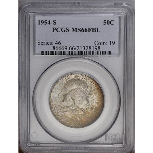 <B>1954-S 50C MS66 Full Bell Lines PCGS.</B></I> Speckles of tobacco-brown and apple-green patina endow this lustrous and exquisitely preserved premium Gem. While the 1954-S is readily available in abraded Mint State grades, it becomes decidedly rare this close to pristine. Crisply struck and original. Population: 50 in 66, 1 finer (1/06).
