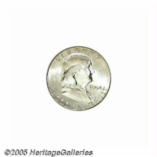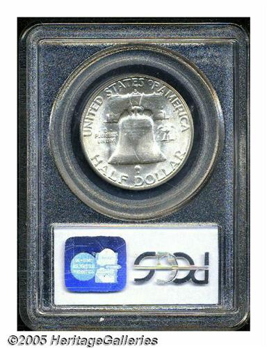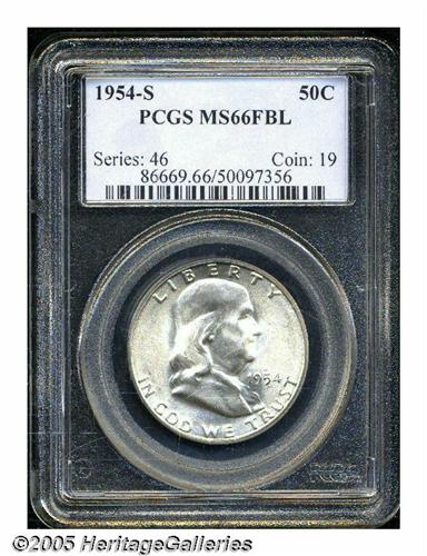 <B>1954-S<50C> MS66 Full Bell Lines PCGS.</B></I> This is a brilliant Superb-Gem coin that has creamy, nearly mark-free surfaces. Both sets of bell lines are complete, the wisp of hair is complete, and the S in PASS AND STOW is also complete. Given that this is a particularly tough issue to find fully struck, watch this coin bring a significant premium. Population: 44 in 66 Full Bell Lines, 1 finer (6/05).<BR><I>From The Southern Collection.</B></I>