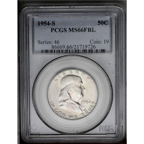 <B>1954-S<50C> MS66 Full Bell Lines PCGS.</B></I> Wisps of lilac and gold color are visible with frosty silver luster on both sides. This is a splendid example, with only one finer coin certified by PCGS. Population: 51 in 66 FBL, 1 finer (2/06).