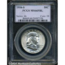 <B>1954-S<50C> MS66 Full Bell Lines PCGS.</B></I> The 1954-S is a very elusive date with Full Bell Lines, and in fact, it is widely regarded as one of the keys to the series. This is a brilliant coin that has creamy, nearly mark-free surfaces. This particular example ranks in the top five of all 1954-S halves we have seen regarding strike. Both sets of bell lines are complete, the wisp of hair is complete, and the S in PASS AND STOW is also complete. Watch this coin bring a significant premium, and it will well be worth it. <BR><BR><B>Important notice:</B> Heritage usually auctions material at the rate of 200-250 lots per hour. On some occasions eBay Live bid software or the Internet may not be able to keep up with the pace of the auction. We recommend placing a realistic absentee bid now as insurance to avoid disappointment. Occasionally the auctioneer may eliminate or reject an eBay Live bid, and the auctioneer may also reopen a lot after the close of the eBay live bidding (usually because we missed an audience bid), and may reject your bid even if it shows you as the winning bidder. By bidding via eBay Live, you agree that Heritage may award the lot to another bidder at its sole discretion under the circumstances described above or any other reasonable circumstances. Since eBay bids are not shown to us until we open the lot on the floor, we treat those bids just like floor bids. In most cases the floor responds before the eBay bid is presented to us, due to Internet lag time, so for consistency we have made it a policy that floor bids are always considered first over tie eBay live bids. Also please note that all Heritage lots purchased through eBay Live carry a 20% Buyer's Premium. Please make sure you read the Terms and Conditions before you bid. </span></font></tr></table></td></tr></table>