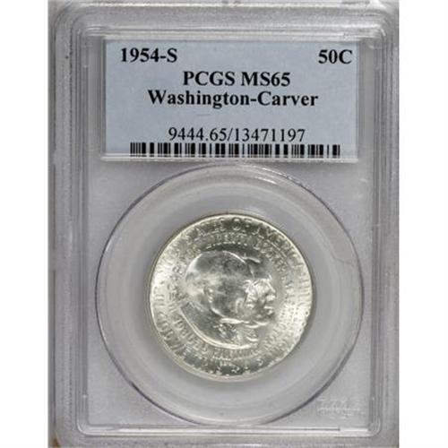 <B>1954-S 50C Washington-Carver MS65 PCGS.</B></I> PCGS Population (486/47). NGC Census: (347/76). Mintage: 122,024. Numismedia Wsl. Price for NGC/PCGS coin in MS65: $85. (#9444)<BR><BR><b>Shipping:</b> Coins & Currency (<a target="_blank" href="http://www.heritageauctions.com/common/shipping.php">view shipping information</a>)