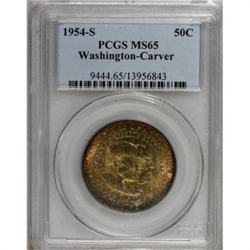 <B>1954-S 50C Washington-Carver MS65 PCGS.</B></I> PCGS Population (485/48). NGC Census: (347/76). Mintage: 122,024. Numismedia Wsl. Price for NGC/PCGS coin in MS65: $85. (#9444)<BR><BR><b>Shipping:</b> Coins & Currency (<a target="_blank" href="http://www.heritageauctions.com/common/shipping.php">view shipping information</a>)