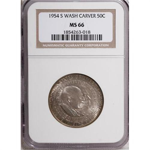 <B>1954-S 50C Washington-Carver MS66 NGC.</B></I> NGC Census: (70/3). PCGS Population (41/1). Mintage: 122,024. Numismedia Wsl. Price for NGC/PCGS coin in MS66: $550. (#9444)<BR><I>From The Frank DuVall Collection of U.S. Commemoratives.</B></I><BR><BR><b>Shipping:</b> Coins & Currency (<a target="_blank" href="http://www.heritageauctions.com/common/shipping.php">view shipping information</a>)