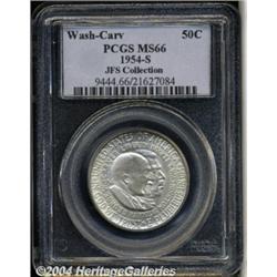 <B>1954-S<50C> Washington-Carver MS66 PCGS.</B></I> An appealing specimen that is rarely seen any finer. This piece exhibits a milky, snow-white texture as well as near-pristine surfaces. A chance to own one of the best. Population: 20 in 66, 1 finer (3/04).<BR><I>Ex: Santa Clara Signature Sale (Heritage, 11/01), lot 6974, which realized $863.</B></I><BR><I>From the JFS Collection, the #1 All-Time PCGS Registry Set.</B></I> <BR><BR><B>Important notice:</B> Heritage usually auctions material at the rate of 200-250 lots per hour. On some occasions eBay Live bid software or the Internet may not be able to keep up with the pace of the auction. We recommend placing a realistic absentee bid now as insurance to avoid disappointment. Occasionally the auctioneer may eliminate or reject an eBay Live bid, and the auctioneer may also reopen a lot after the close of the eBay live bidding (usually because we missed an audience bid), and may reject your bid even if it shows you as the winning bidder. By bidding via eBay Live, you agree that Heritage may award the lot to another bidder at its sole discretion under the circumstances described above or any other reasonable circumstances. Since eBay bids are not shown to us until we open the lot on the floor, we treat those bids just like floor bids. In most cases the floor responds before the eBay bid is presented to us, due to Internet lag time, so for consistency we have made it a policy that floor bids are always considered first over tie eBay live bids. Also please note that all Heritage lots purchased through eBay Live carry a 20% Buyer's Premium. Please make sure you read the Terms and Conditions before you bid. </span></font></tr></table></td></tr></table>