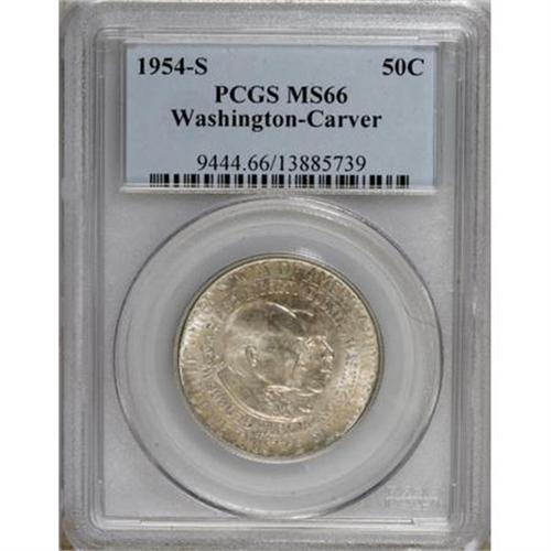 <B>1954-S 50C Washington-Carver MS66 PCGS.</B></I> PCGS Population (41/1). NGC Census: (70/3). Mintage: 122,024. Numismedia Wsl. Price for NGC/PCGS coin in MS66: $550. (#9444)<BR><BR><b>Shipping:</b> Coins & Currency (<a target="_blank" href="http://www.heritageauctions.com/common/shipping.php">view shipping information</a>)