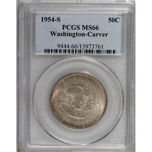 <B>1954-S 50C Washington-Carver MS66 PCGS.</B></I> PCGS Population (47/1). NGC Census: (73/3). Mintage: 122,024. Numismedia Wsl. Price for NGC/PCGS coin in MS66: $550. (#9444)<BR><BR><b>Shipping:</b> Coins & Currency (<a target="_blank" href="http://www.heritageauctions.com/common/shipping.php">view shipping information</a>)