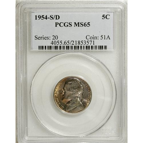 <B>1954-S/D 5C MS65 PCGS.</B></I> PCGS Population (72/3). NGC Census: (74/64). Mintage: 29,384,000. Numismedia Wsl. Price for NGC/PCGS coin in MS65: $125. (#4055)<BR><BR><b>Shipping:</b> Coins & Currency (<a target="_blank" href="http://www.heritageauctions.com/common/shipping.php">view shipping information</a>)