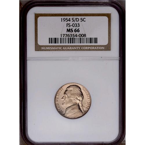 1954-S/D 5C MS66 NGC. FS-033. The base of the D mintma 1954-S/D[5C] MS66 NGC.