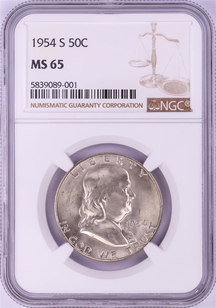 One 1954-S Franklin Half Dollar Coin NGC MS65. NGC Certified.