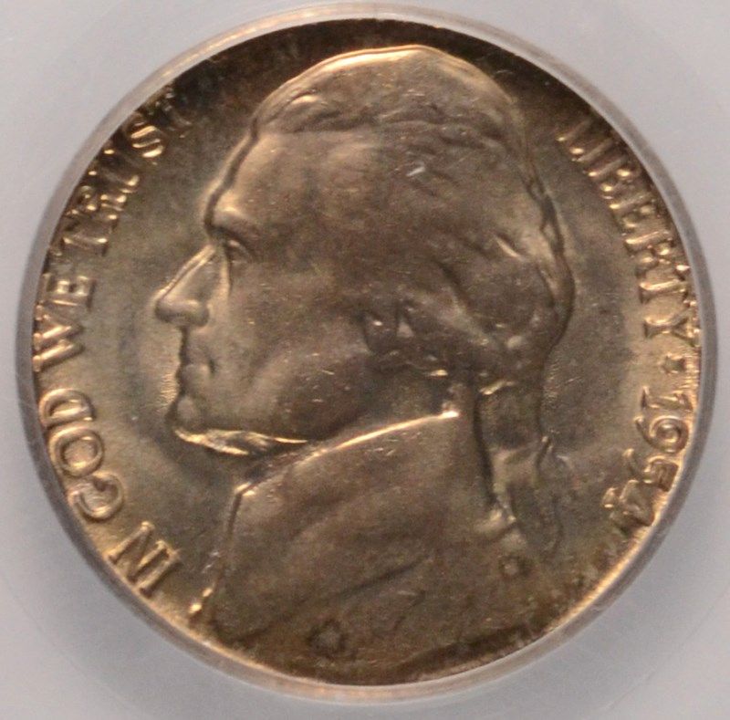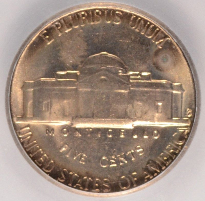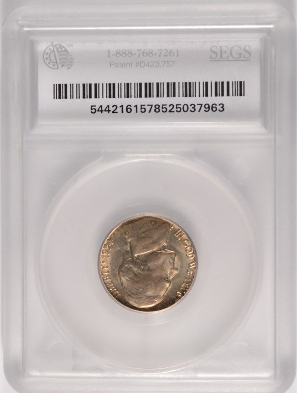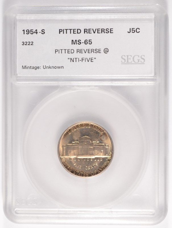 1954-S JEFFERSON NICKEL, SEGS MS-65 GEM, RARE MINT ERROR "NTI-FIVE"