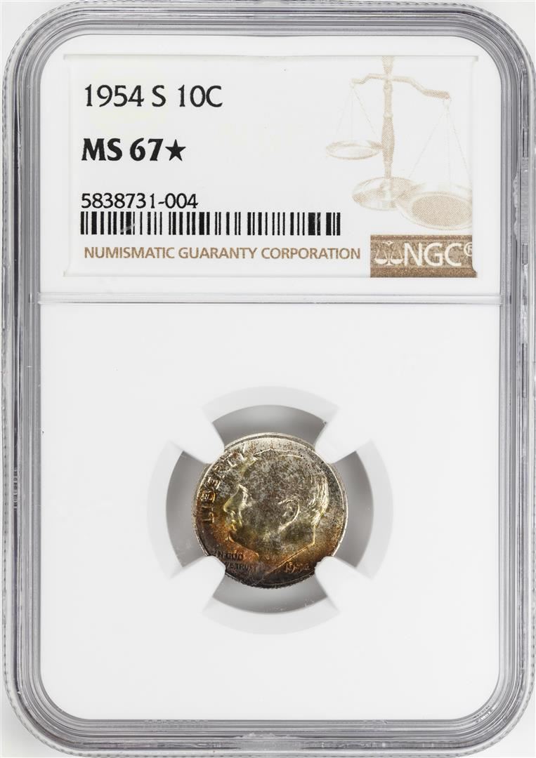 One 1954-S Roosevelt Dime Coin NGC MS67* Star Amazing Toning. NGC Certified.