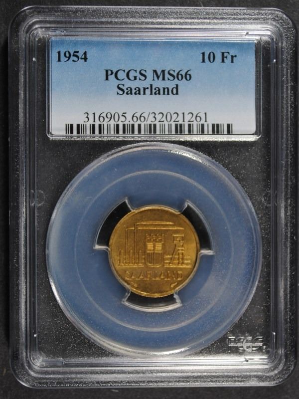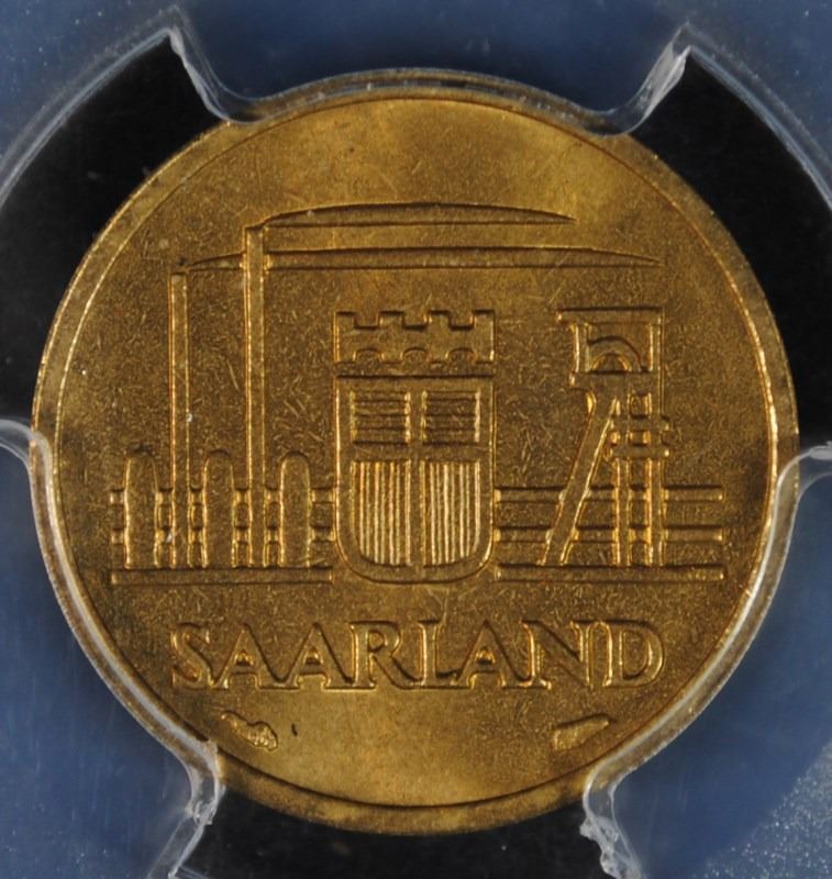 SAARLAND ONLY PRODUCED COINS FOR TWO YEARS AND THE COINS ARE EXTREMELY RARE IN HIGHER GRADES, PCGS HAS GRADED LESS THAN 100 COINS IN ALL GRADES! ESTIMATE, $200.00 TO $250.00