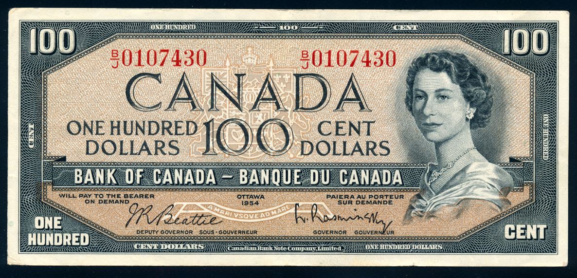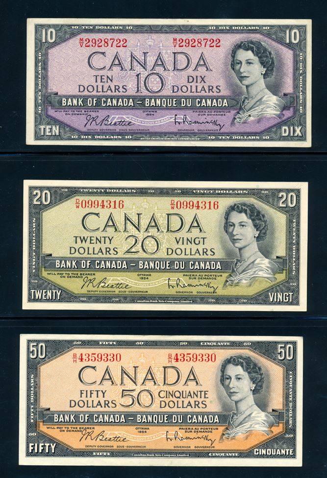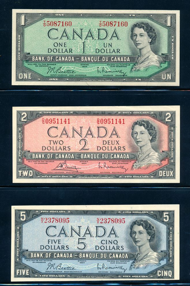 1954, denomination set from $1 to $100, Beattie Rasminsky, Avg. VF-EF. 7 notes, $188 FV