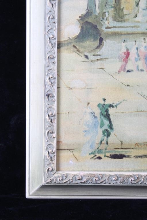 For your consideration is this 1954 Singed Roderick Montague Acryllic Painting. This is a beautiful painting from the Mid Century of a Victorian center full of statues and observers. Three lovely woman stand in front of the giant pillar and horse statue with a couple closest to the edge of the picture standing a step down from the center square also observing the horse statue. The frame is molded and shows a pristine border and eye grabbing floral design. The measurements of this painting are 31" x 13" x 2 1/4".