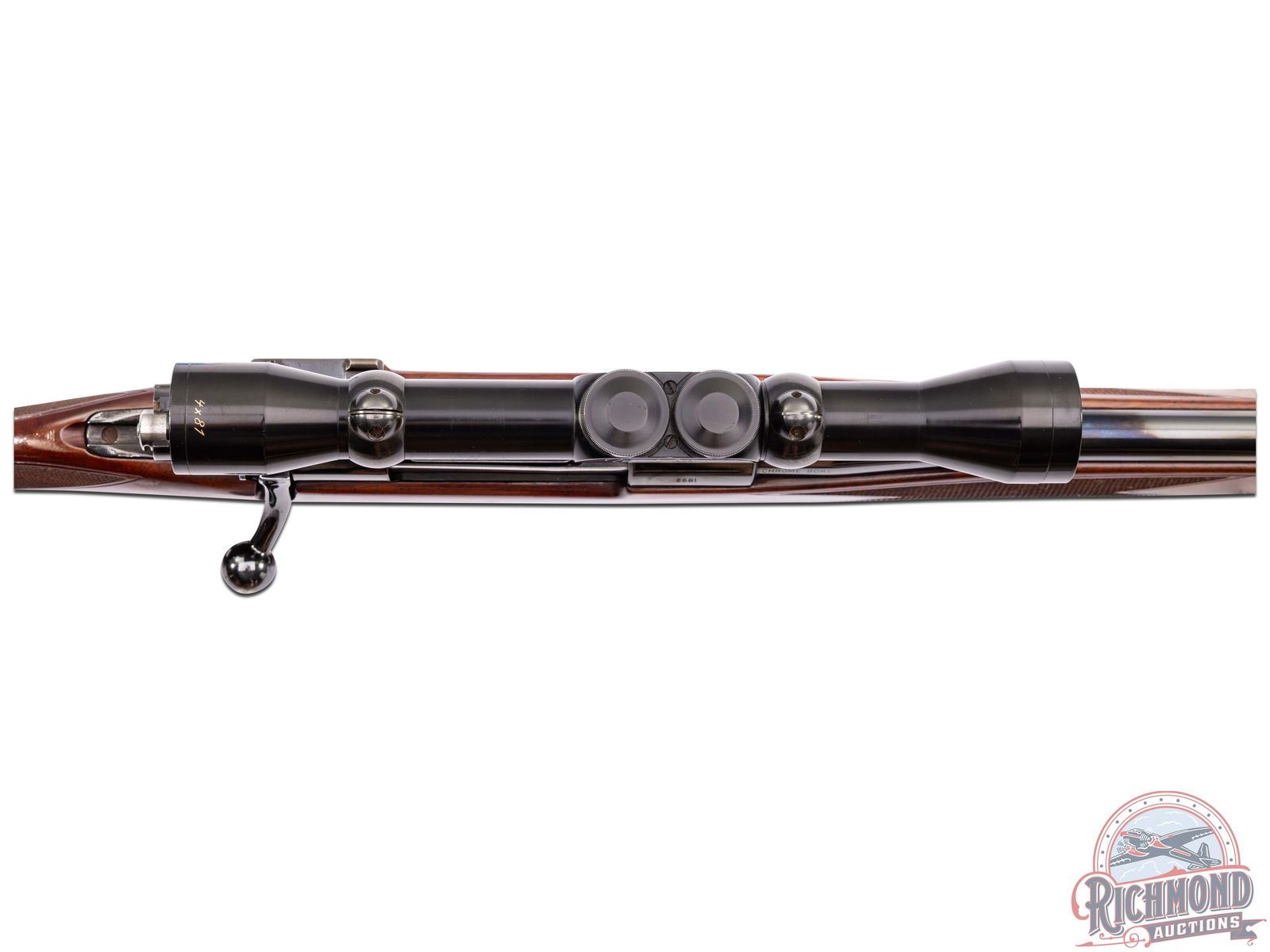 Retains 90% original finish with most notable wear at the muzzle. Stock appears to have been re-stained in the Rosewood tone, and does show some dings and scuffs most notable around the cheekpiece. Great bore and good mechanics. Optics are clear.
