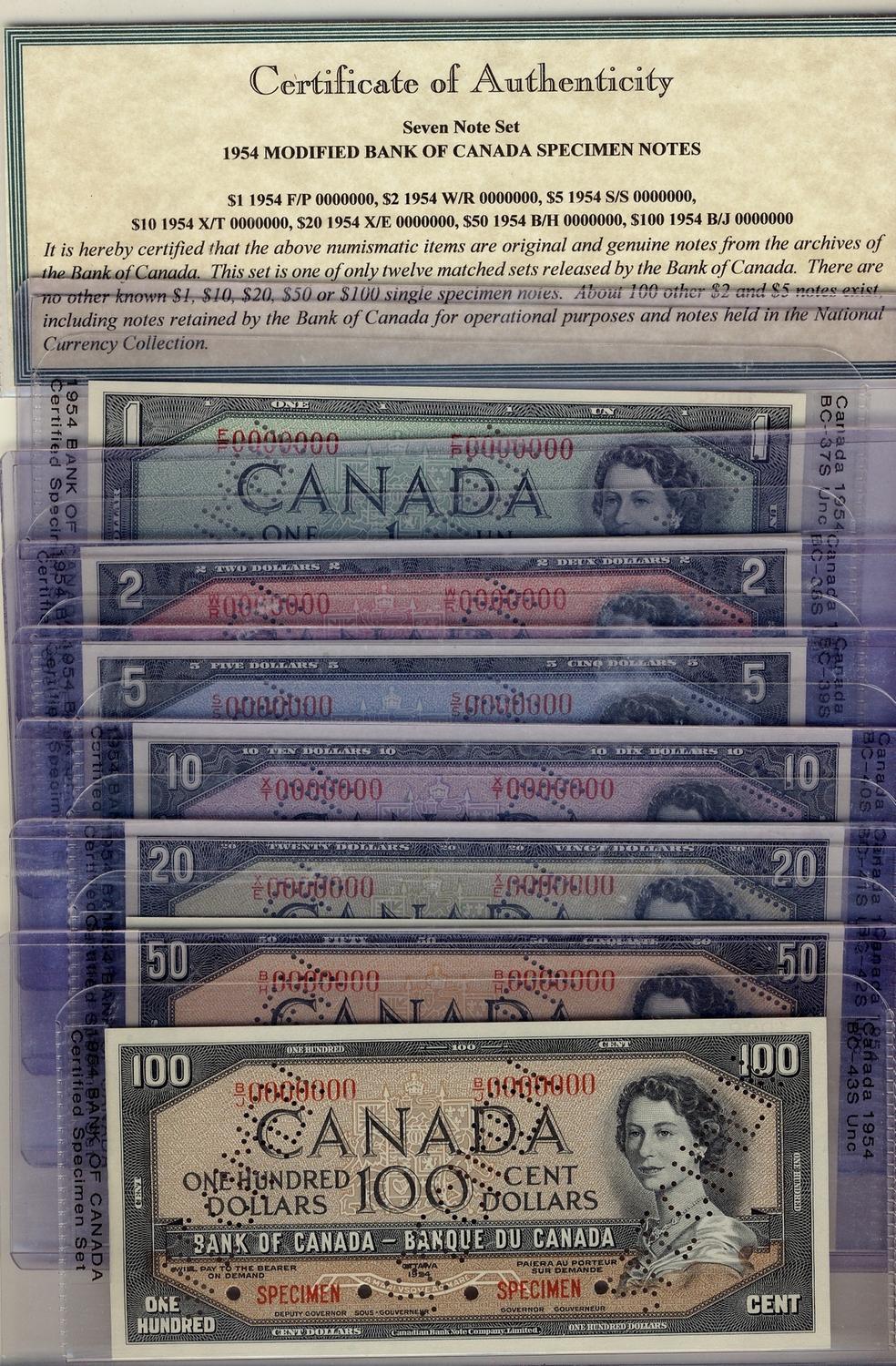 1954 Specimen set from the $1-$100, all notes are choice. (BC-37s, BC-38s, BC-39s, BC-40s, BC-41s, BC42s, BC-43s) Believed to be only 7 complete sets in existence. Underrated and rarer than the 1937 Specimen set.