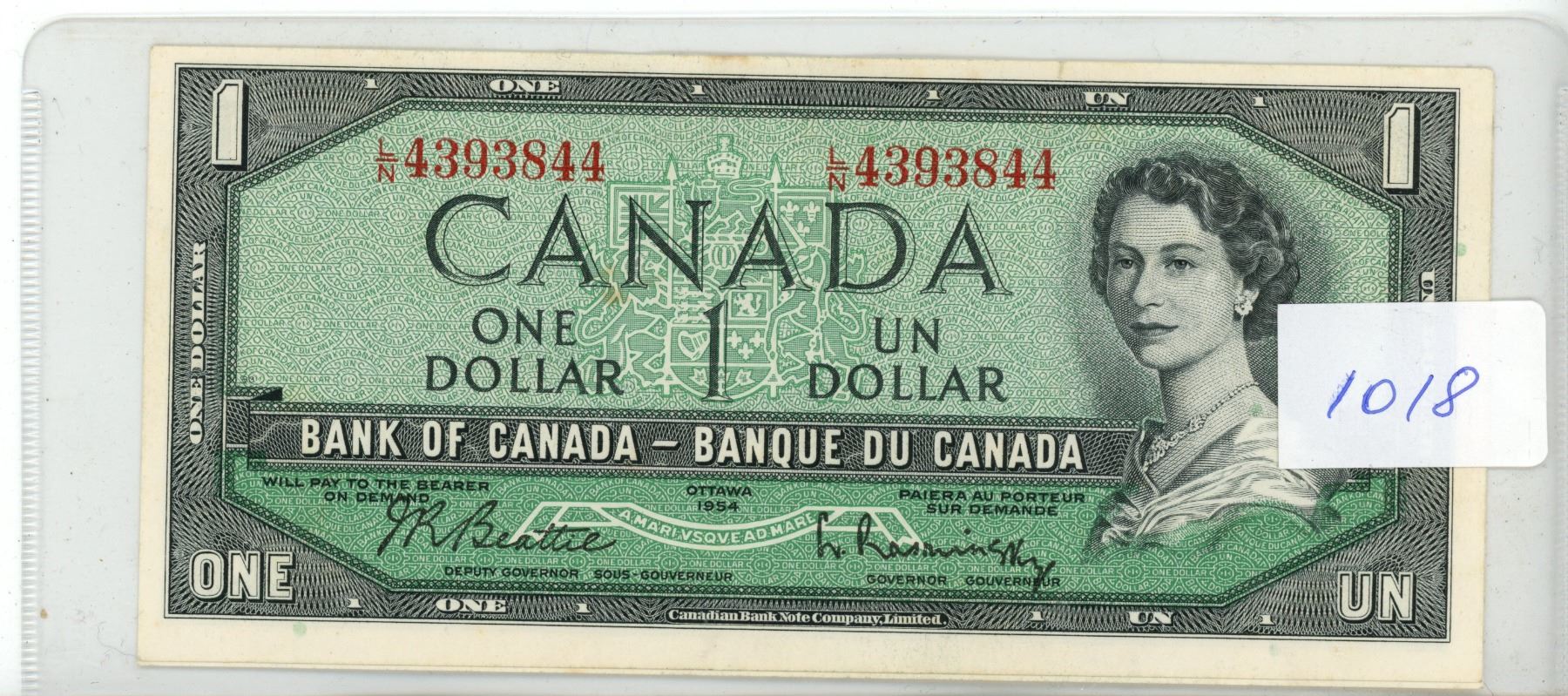 1954 TWO CONSECUTIVE $1.00 Notes #L/N4393844-845 signed by JR Beattie & L Rasminsky - UNCIRCULATED