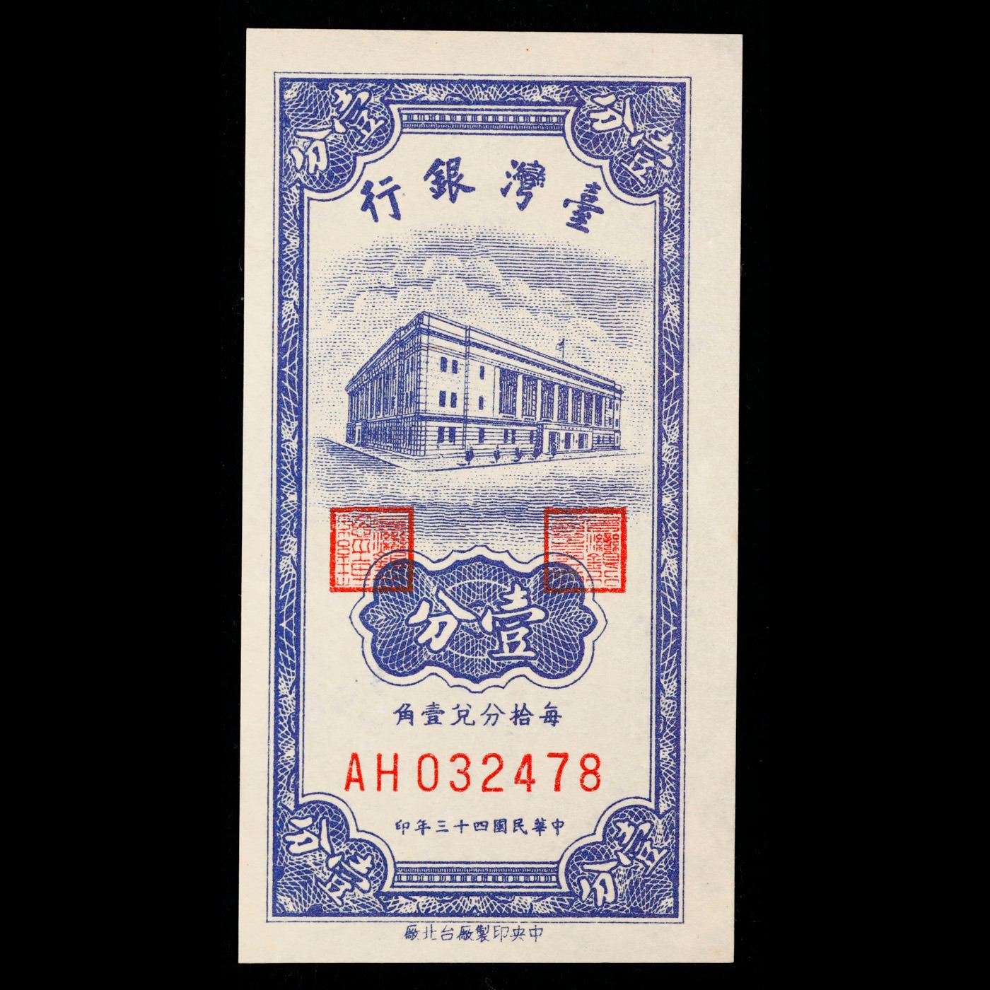 1954 Taiwan 1 Cent Banknote Grades Gem+ CU. The Bank of Taiwan first issued the New Taiwan dollar on 15 June 1949 to replace the Old Taiwan dollar, which was in use from 1946 to 1949 following Japan's handover of Taiwan to China, at a ratio of 40,000 to one. The first goal of the New Taiwan dollar was to end the hyperinflation that had plagued Nationalist China due to the Chinese Civil War.