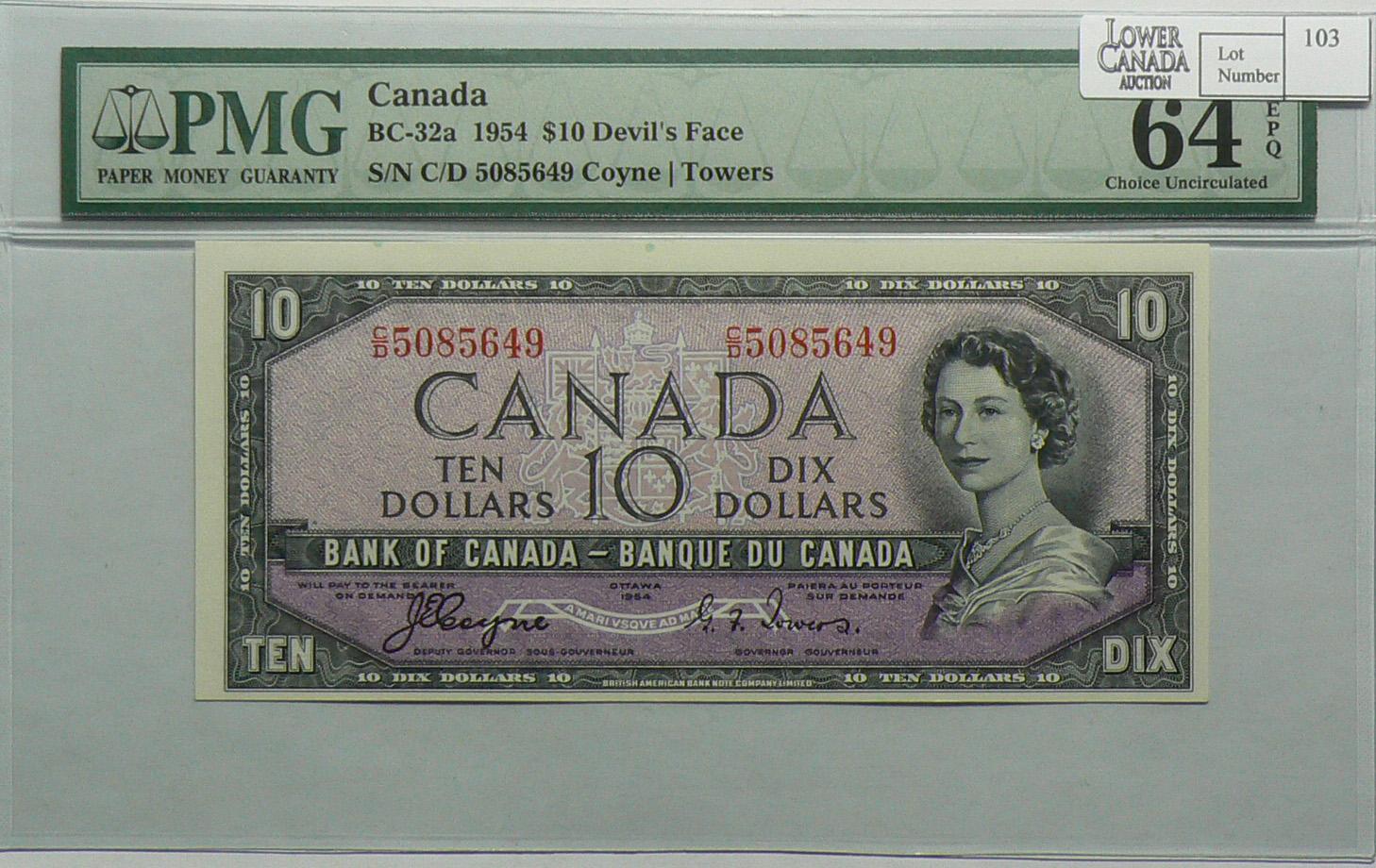 1954 Ten Dollars Devil's Face, BC-32a, PMG UNC-64, Coyne Towers, serial C/D5085649.