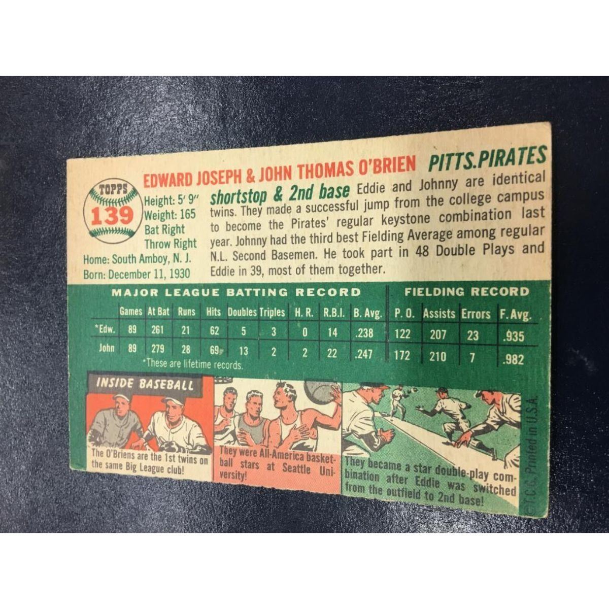 A 1954 Topps #139 Edward Joseph & John Thomas O'Brien Baseball Card. Two Legends Of The Game In One Card. This Card Has 2 Facsimile Autographs of The 2 Players. View Photos For Further Details.
