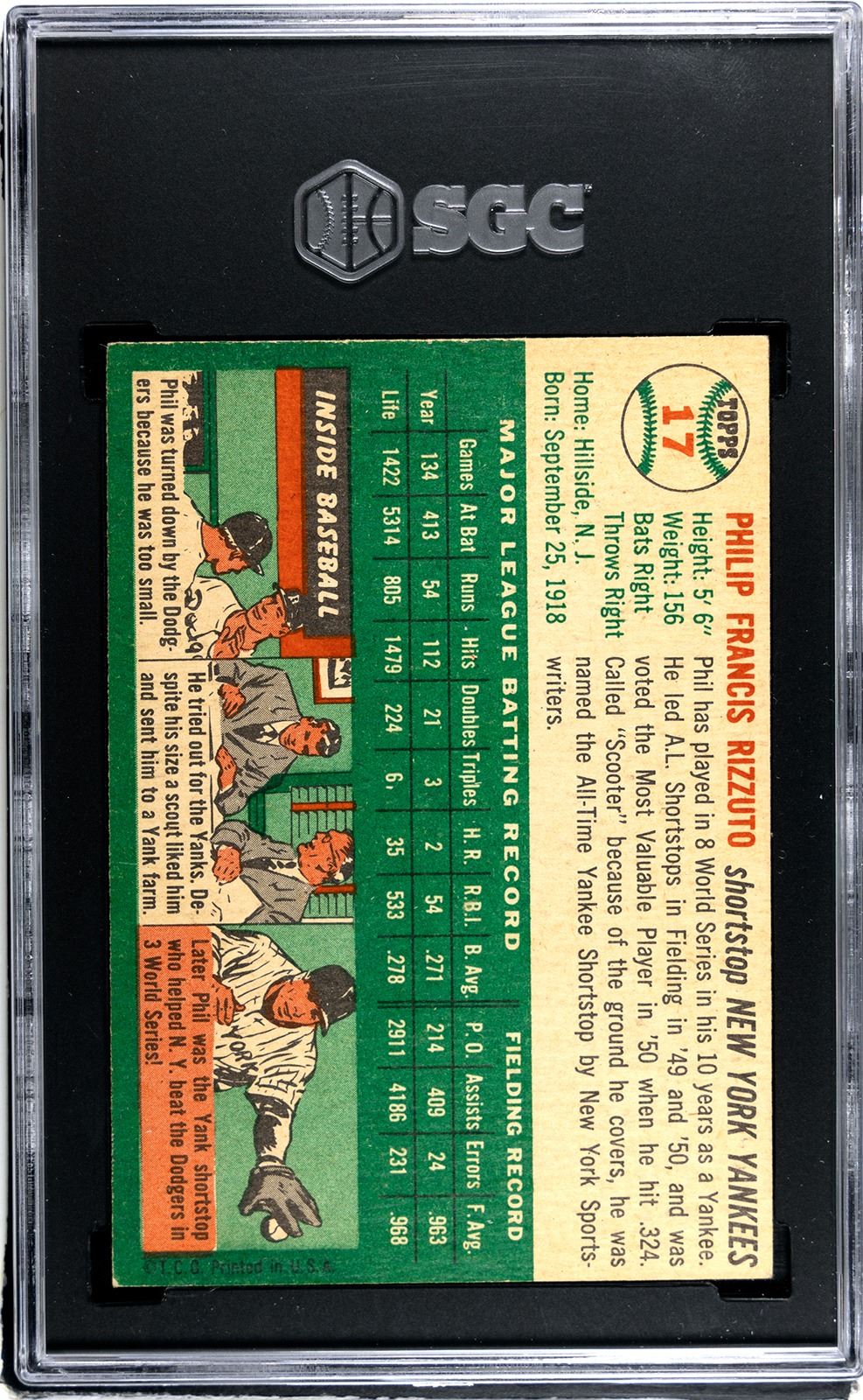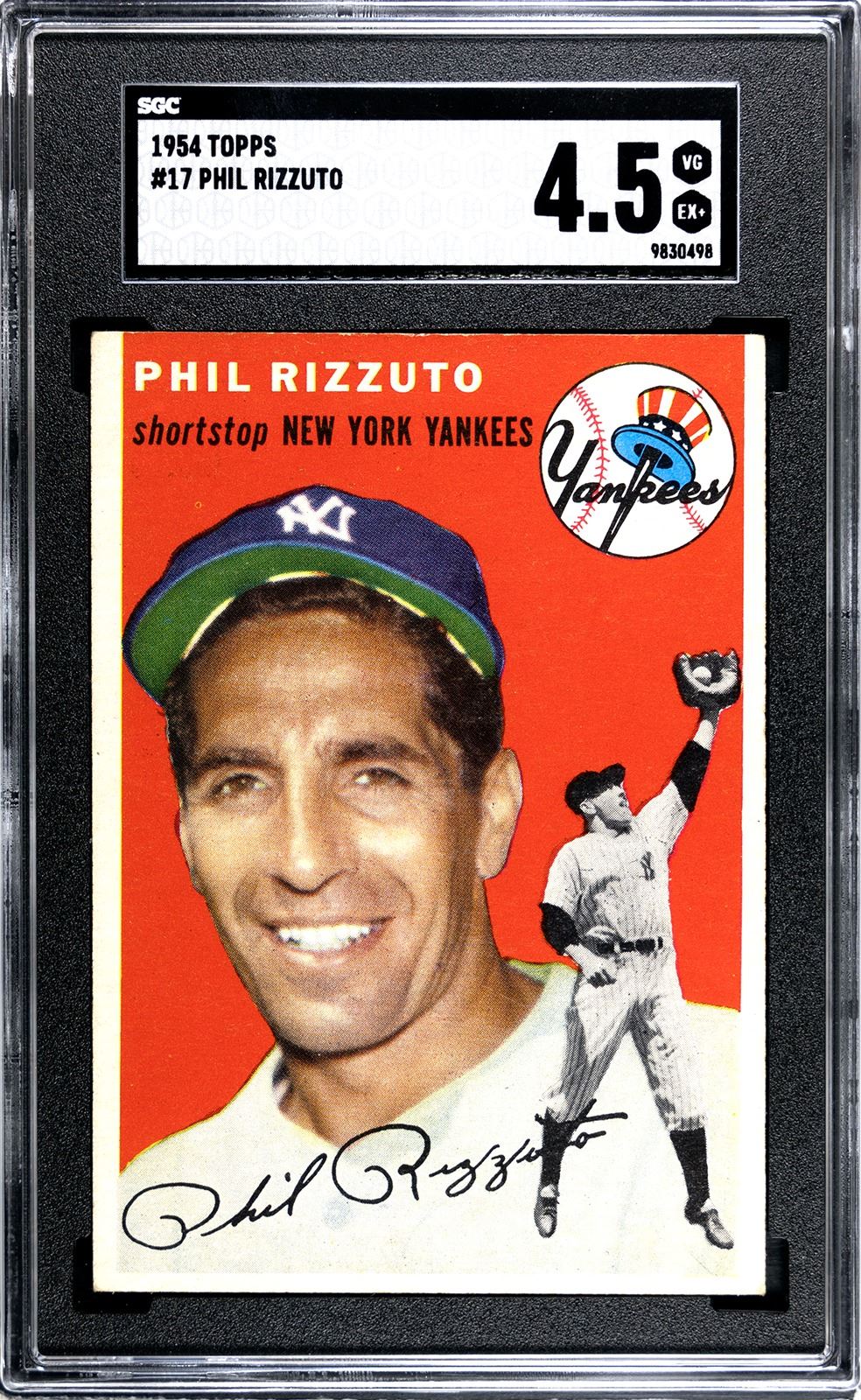 Nice mid-grade card of the Yankees great and HOFer, Phil "Scooter" Rizzuto. AL MVP in 1950 and winner of 7 World Series titles. Graded a solid 4.5 VG-EX+ by SGC!
