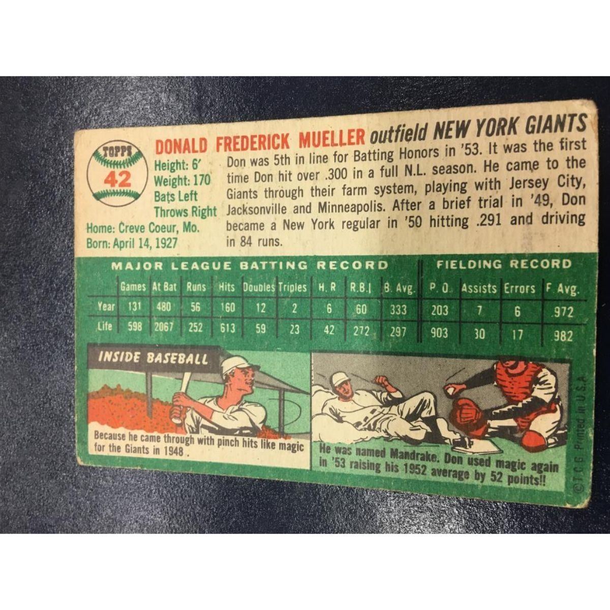 A 1954 Topps Don Mueller #42 Baseball Card That Has A Facsimile Autograph From The 1950's. Great Card To Add To Any Collection. View Photos For Further Details.