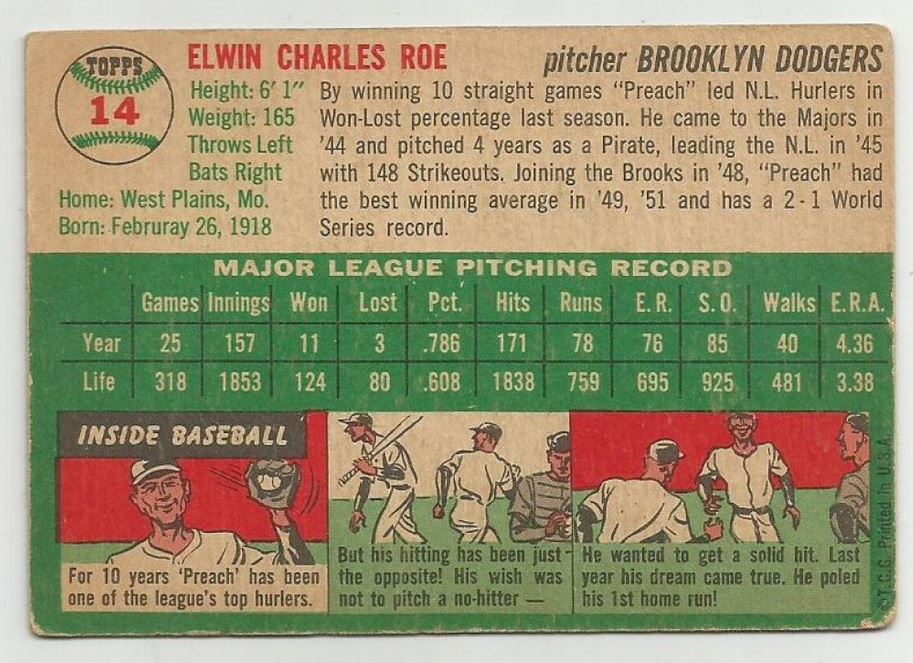 This is NOT a reprint, but an Original 1954 Topps Preacher Roe Card #14 in Very Good Condition.