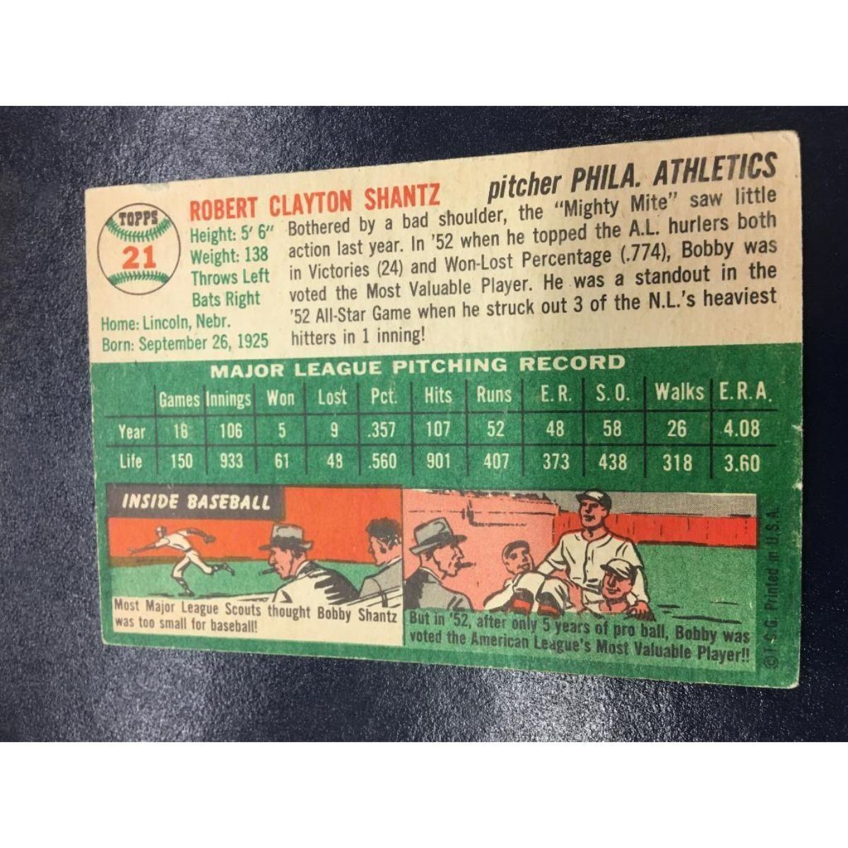 1954 Topps Set Break # 21 - Bobby Shantz Baseball Card That Has The Facsimile Autograph On The Front. A Great Collector Card From The 1950's. View Photos For Further Details.