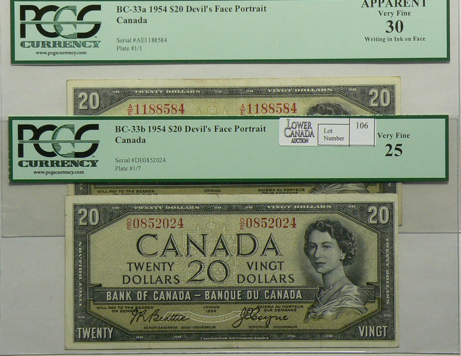 1954 Twenty Dollars Devil's Face, BC-33a, PCGS VF-30, serial A/E1188584 & BC-33b, PCGS VF-25, seria