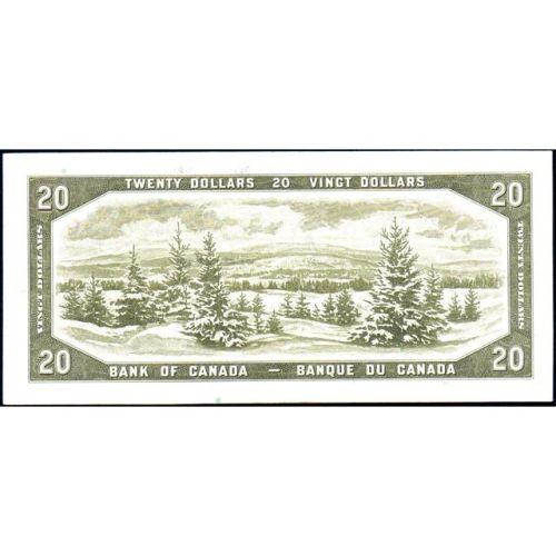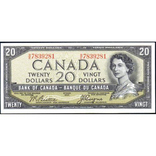 1954 Twenty Dollars Devil’s Face, Beattie-Coyne, BC-33b Serial Number B/E7839281, Uncirculated. Very slightly off centre toward the left and top