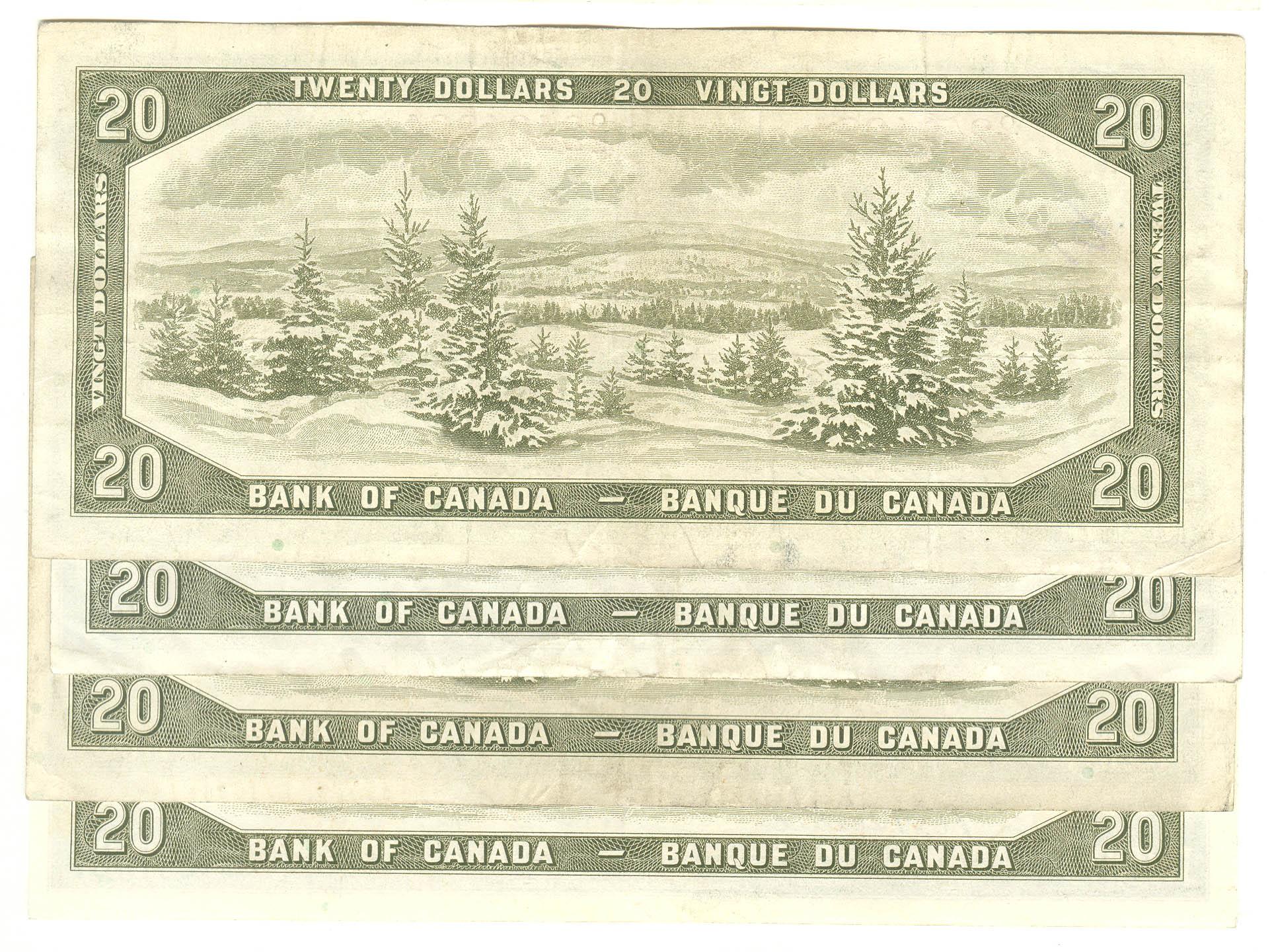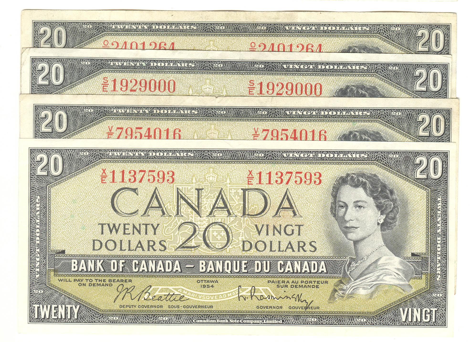 1954  Twenty Dollars  Modified, BC-41b, Beattie Rasminsky, serial O/E VF with writing, S/E EF, V/E VF & X/E EF. Lot of 4 notes.