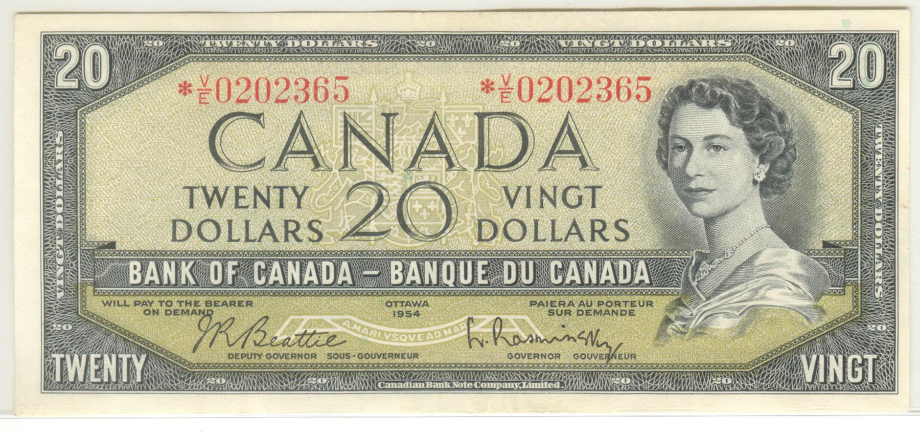 1954 Twenty Dollars Replacement Modified, BC-41bA, AU, Beattie Rasminsky, serial *V/E0202365.