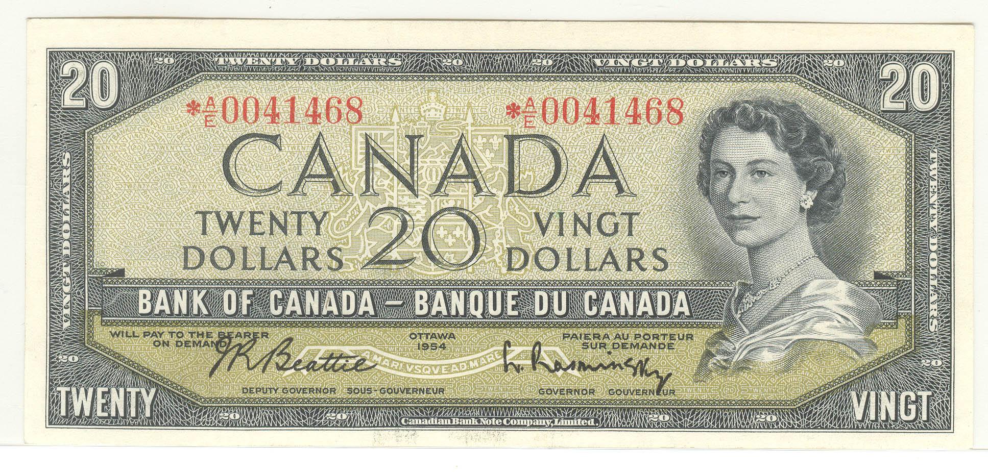 1954  Twenty Dollars  Replacement  Modified, BC-41bA, Original UNC, Beattie Rasminsky, serial *A/E0041468.