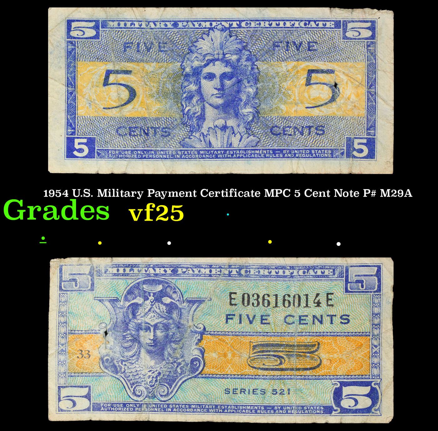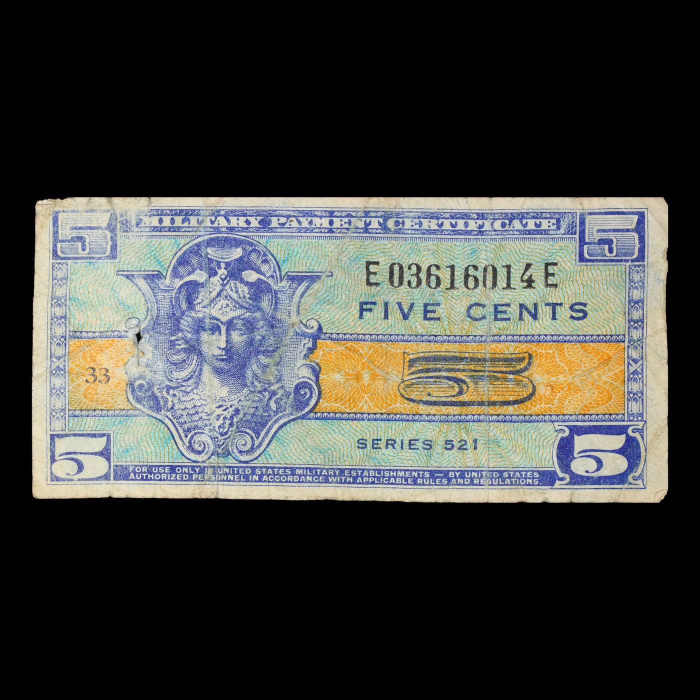 1954 U.S. Military Payment Certificate MPC 5 Cent Note P# M29A Grades vf+. Allied Military Currency ("AMC") was a form of currency issued by the Allied powers during World War II, to be issued to troops entering liberated or newly occupied countries. Historically, soldiers serving overseas had been paid in local currency rather than in their "home" currency. Most cash drawn by soldiers would go directly into the local economy, and in a damaged economy the effects of a hard currency such as the dollar circulating freely alongside weaker local currencies could be severely problematic, risking severe inflation.