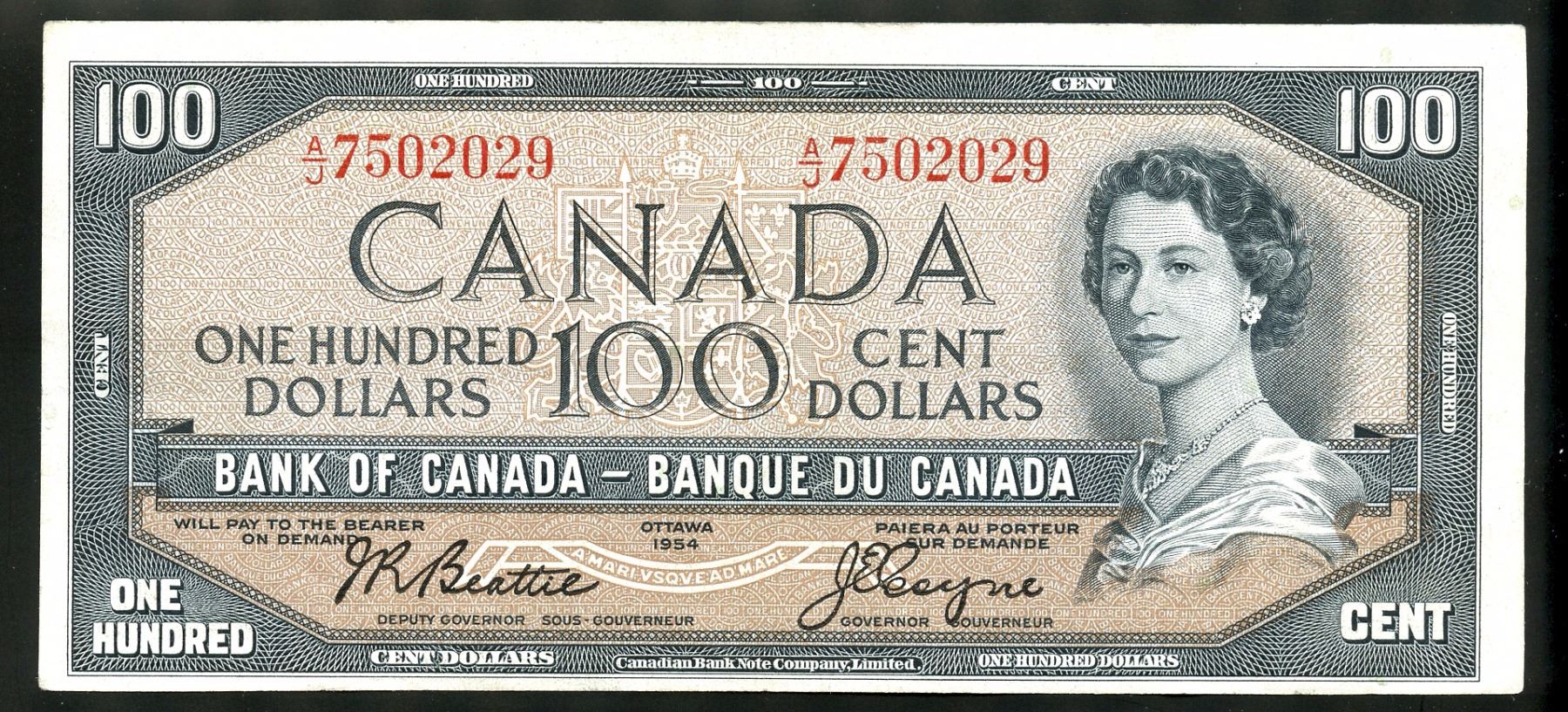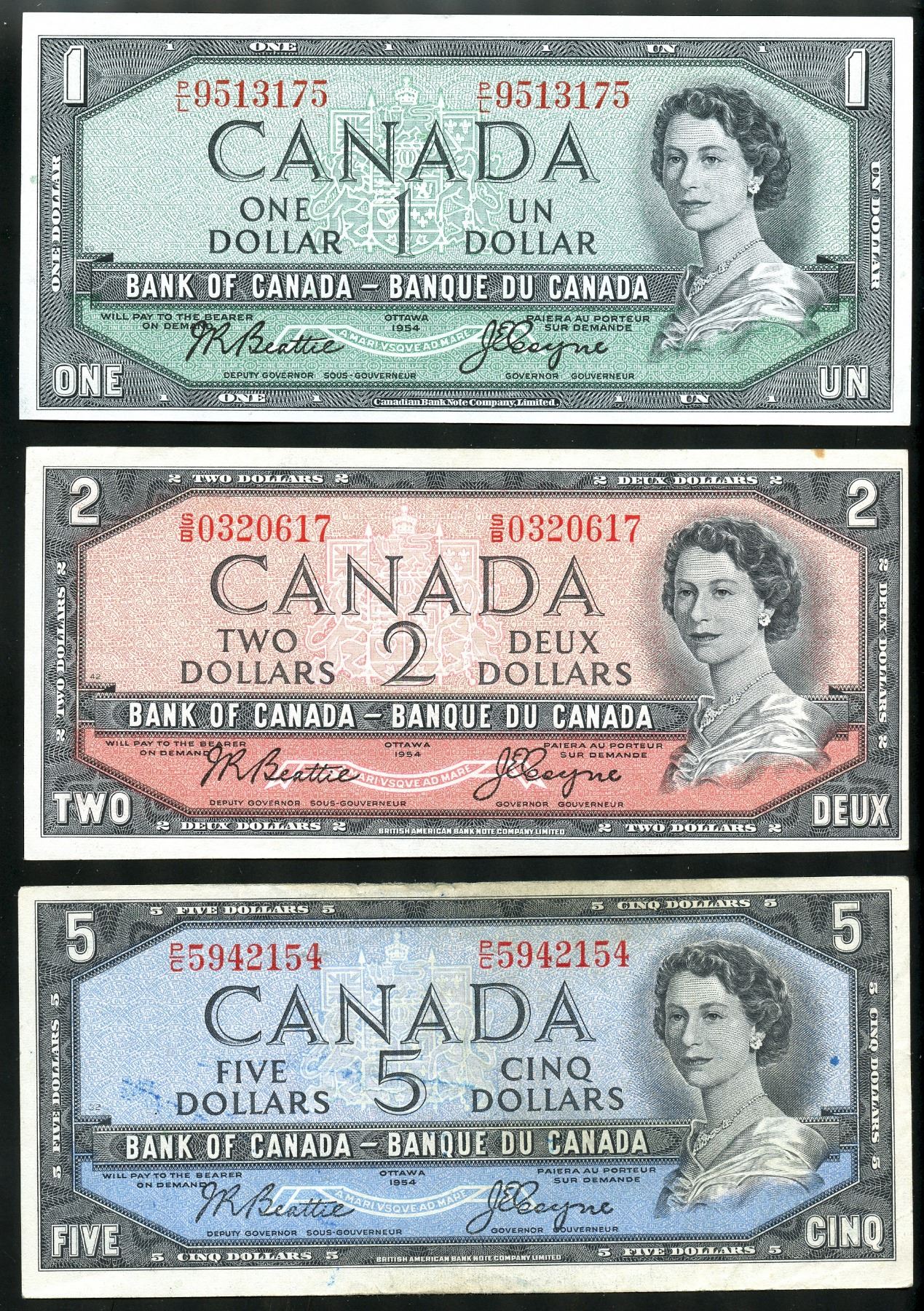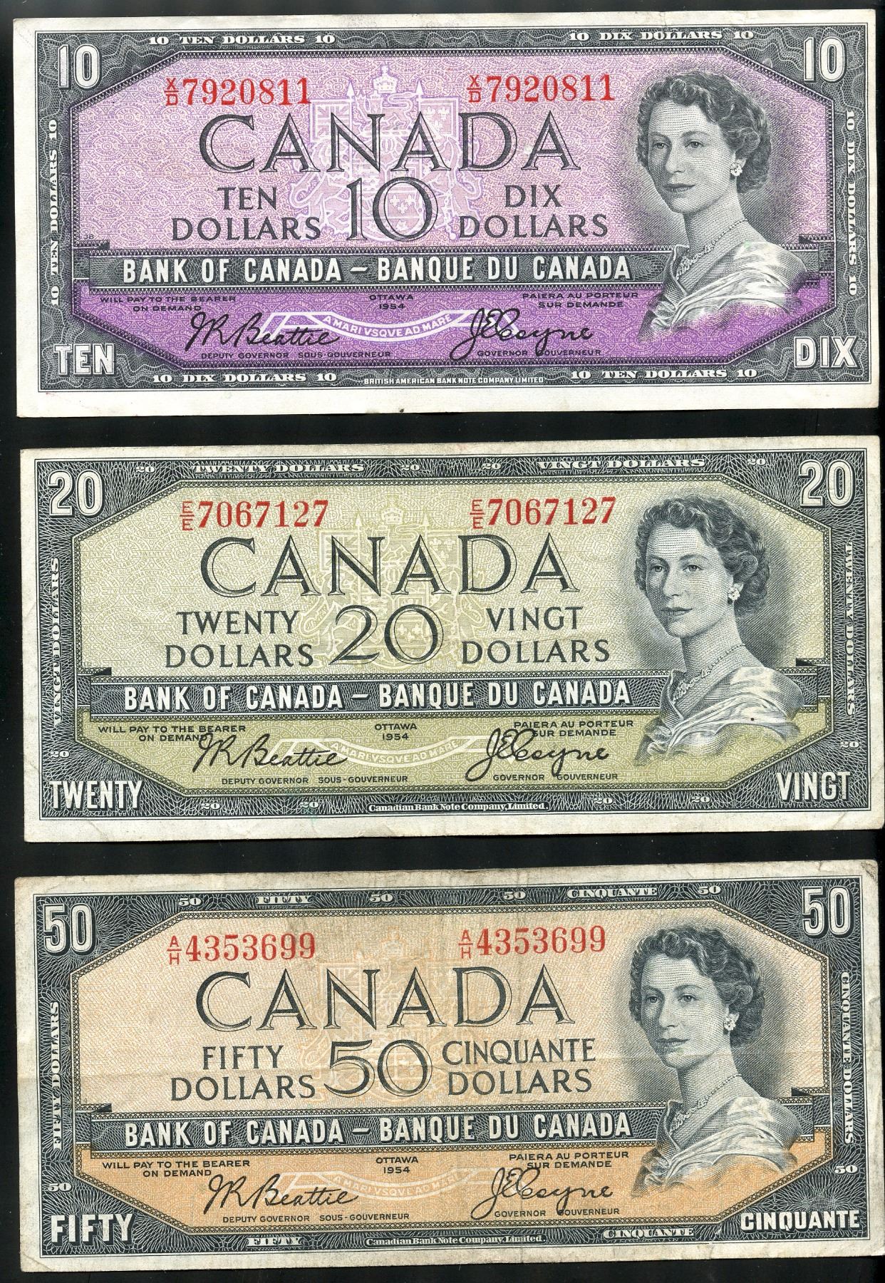 1954 complete banknote set $1 to $100, Beattie/Coyne signature, modified portrait, all VF/EF for grade.