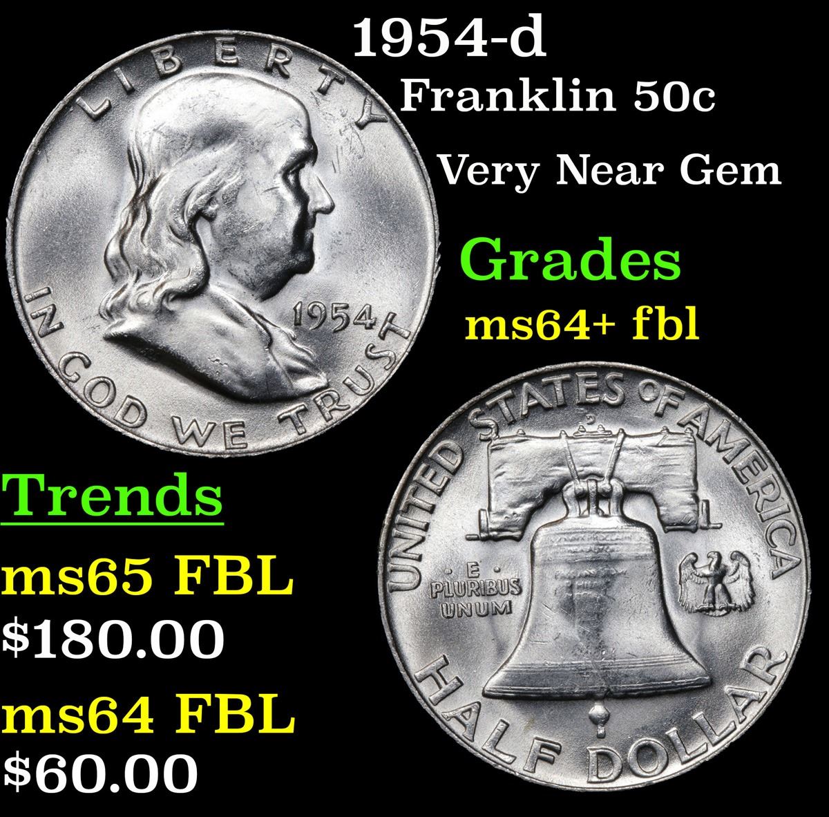 1954-d . Very Near Gem Franklin Half Dollar 50c Grades Choice Unc+ FBL.