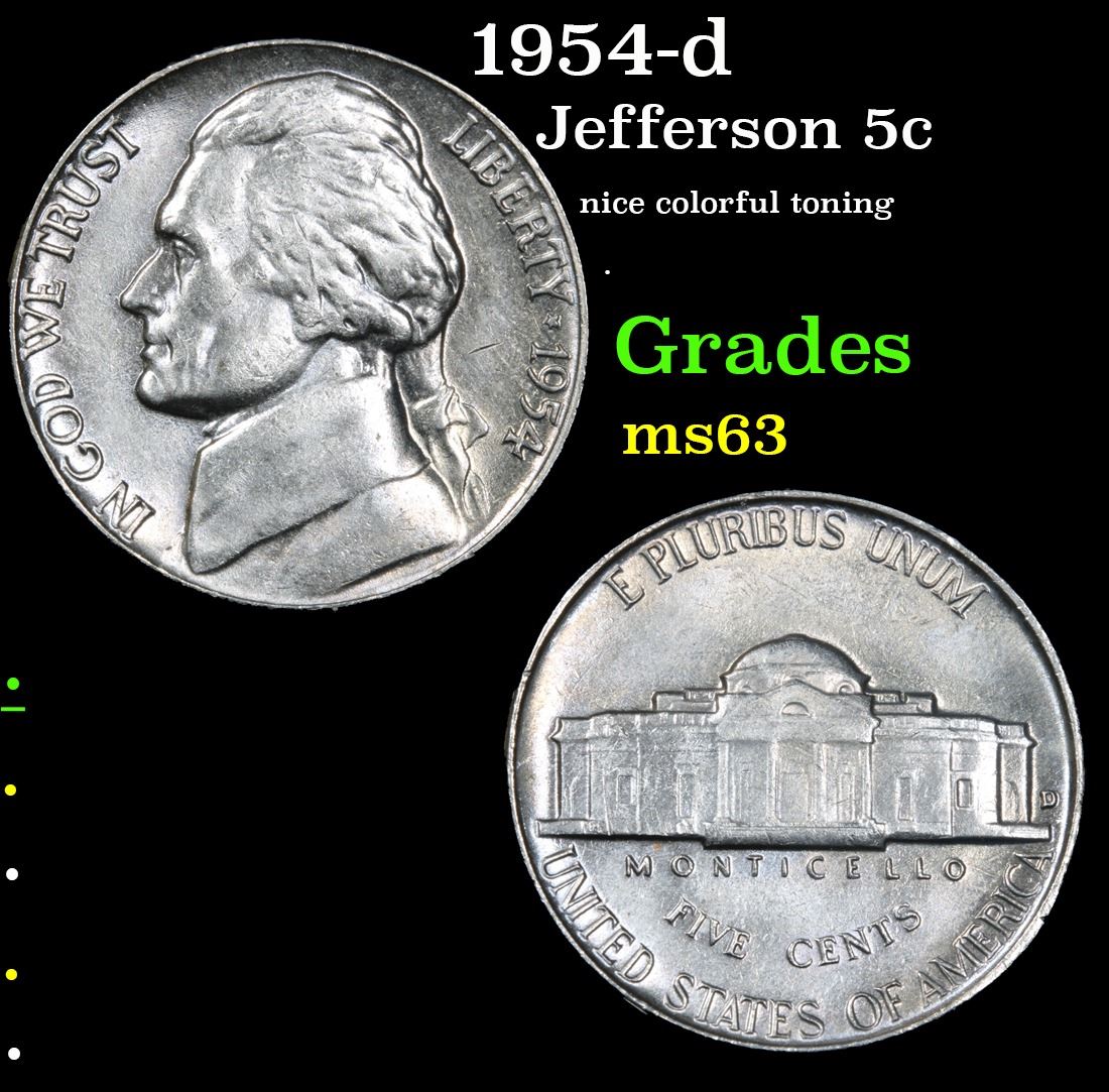 1954-d nice colorful toning . Jefferson Nickel 5c Grades Select Unc.