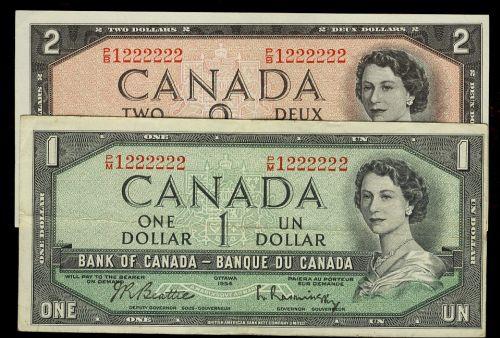 1954 matching pair with ser# 1222222, BC-37bi $1 F+, BC-38a $2 EF-AU.