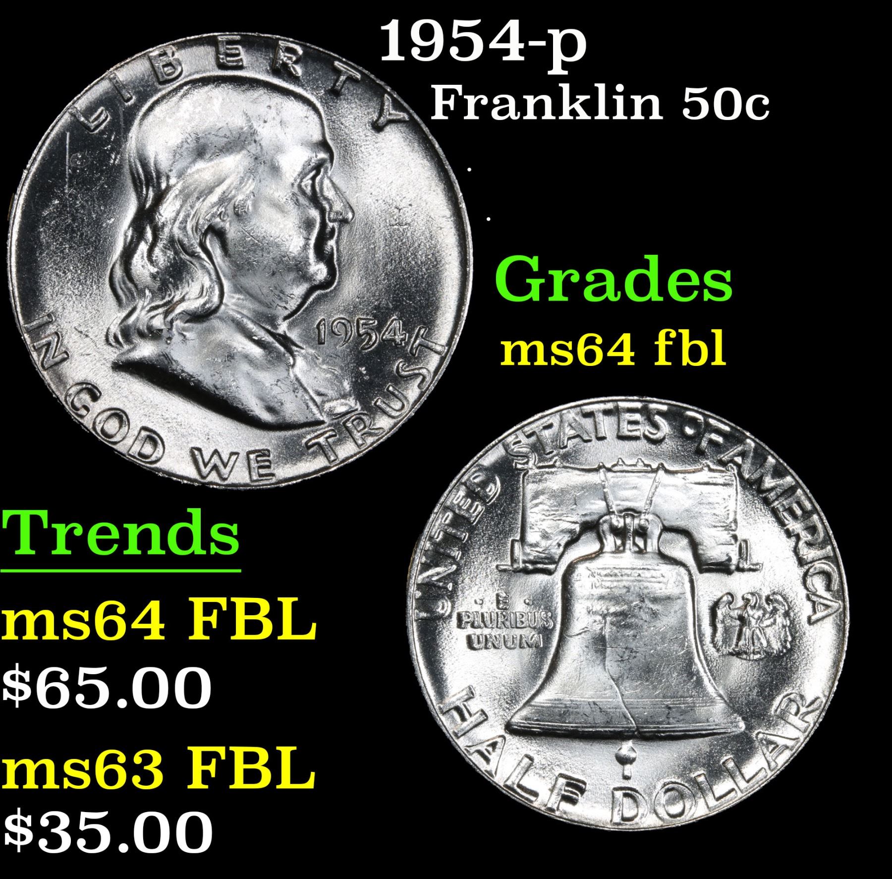 1954-p Franklin Half Dollar 50c Grades Choice Unc FBL.