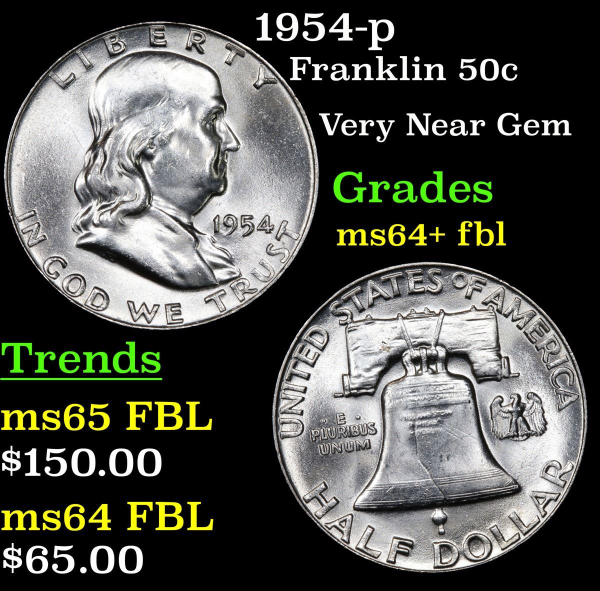 1954-p . Very Near Gem Franklin Half Dollar 50c Grades Choice Unc+ FBL.